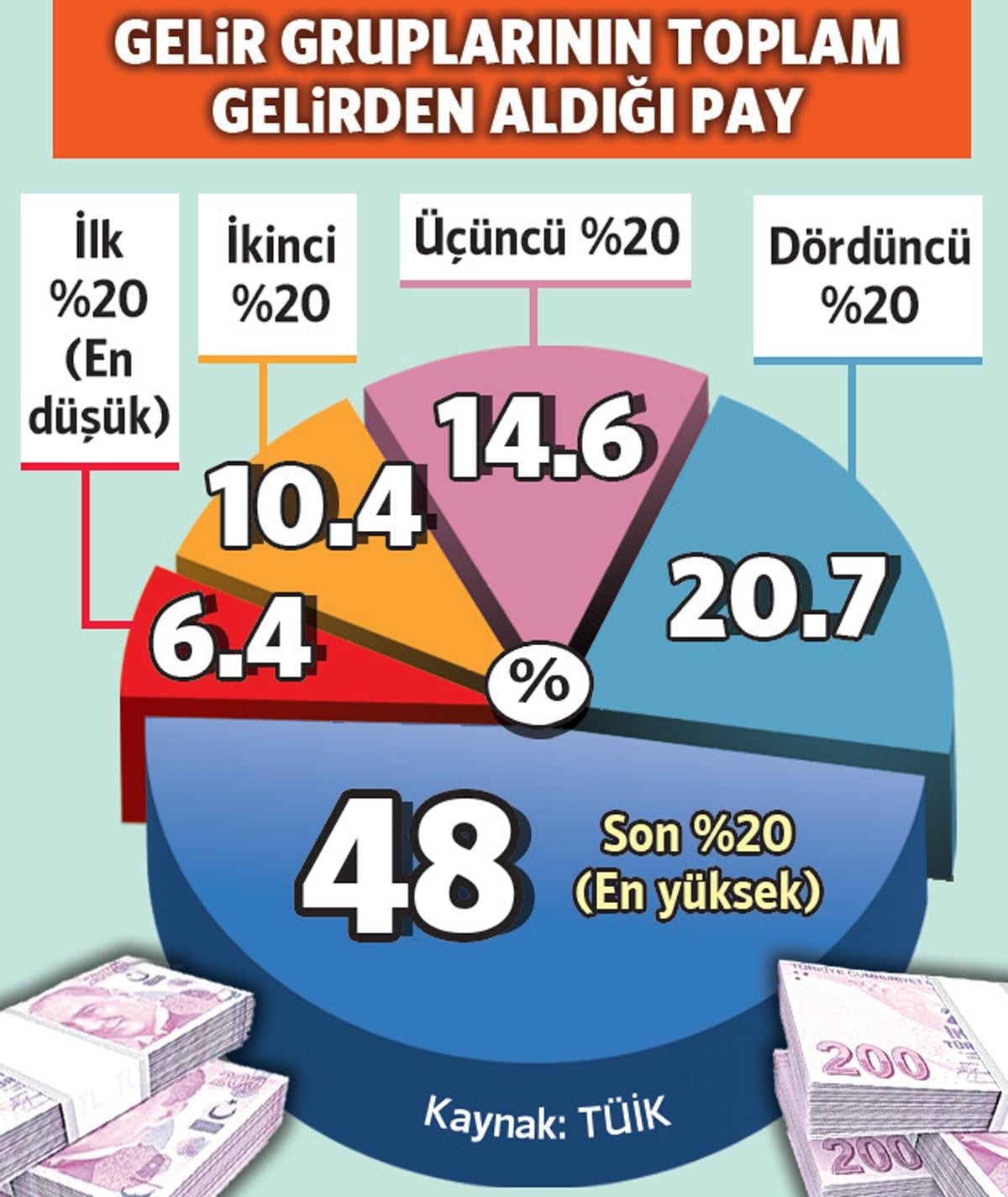 Türkiye İstatistik Kurumu (TÜİK) tarafından yayınlanan “Gelir Dağılımı İstatistikleri, 2025” raporuna göre, en zengin yüzde 20’lik kesim, toplam gelirin yüzde 48’ini elde etti. Bu rakam, en düşük gelire sahip yüzde 20’lik kesimin aldığı pay olan yüzde 6.4’ün oldukça üzerinde.